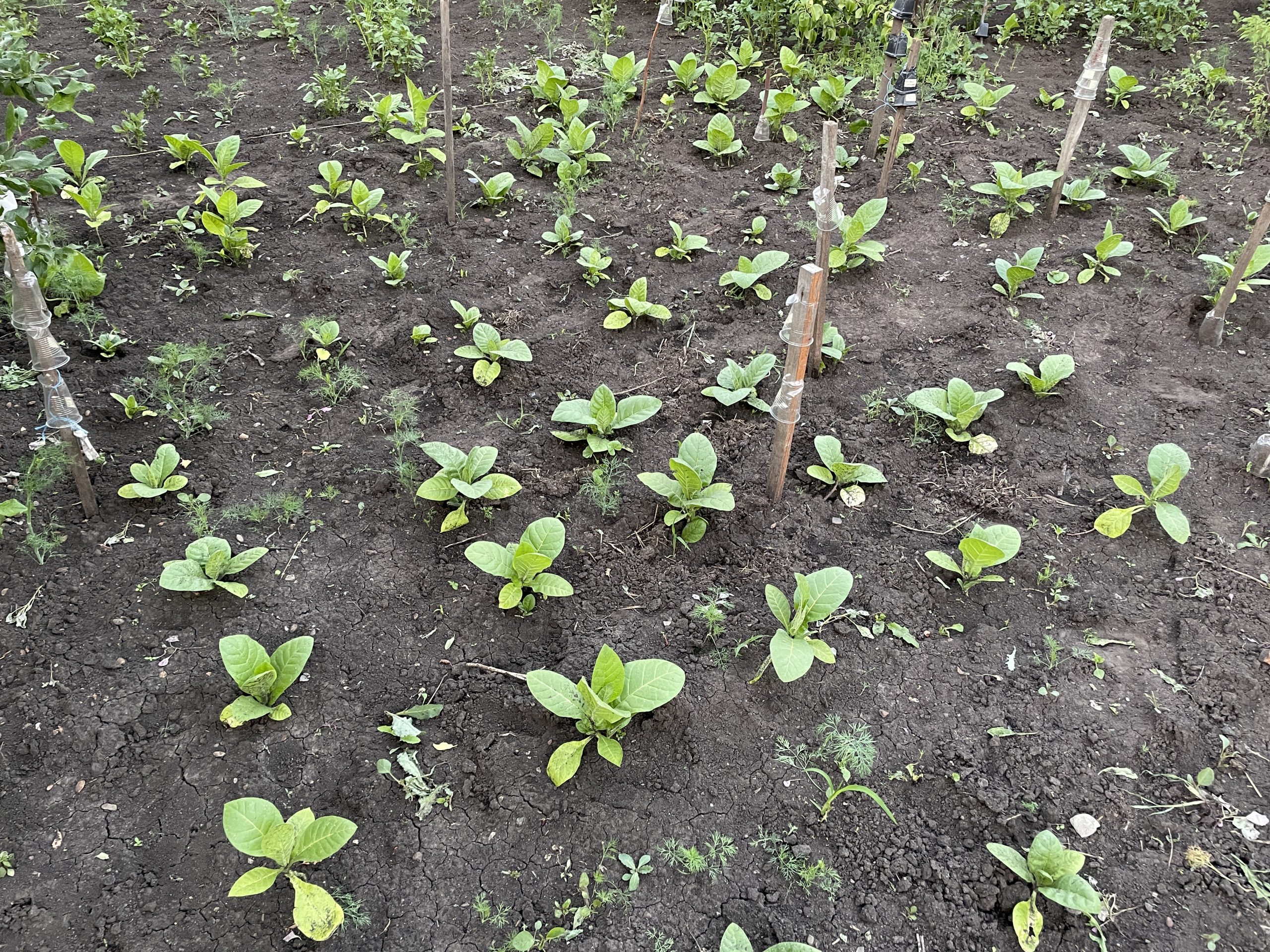 В первые две недели табак поливают через день. Затем поливы сводятся к минимуму. Корни у растений очень мощные и глубоко прорастают. Засухи табак не боится.
